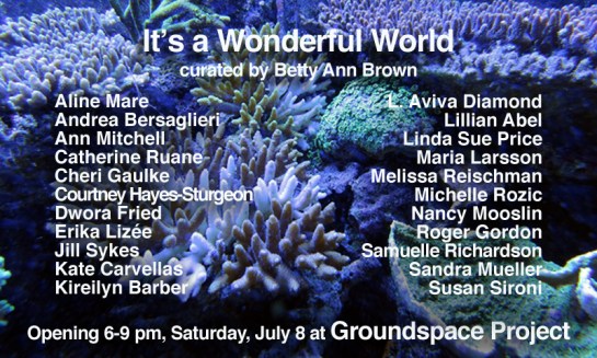 Groundspace Project is happy to announce IT’S A WONDERFUL WORLD, curated by Betty Ann Brown, a juried art exhibition scheduled for July 8-22, 2017, with a reception for the artists Saturday, July 8, 6:00 to 9:00 pm. Three artists will be selected out of the IT’S A WONDERFUL WORLD exhibition for CASH prizes.